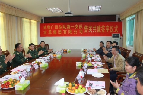 為進(jìn)一步加強警政警民團結(jié),密切警民關(guān)系,促進(jìn)“三個文明”建設(shè)共同發(fā)展。我集團公司與廣西武警總隊一支隊建立警民共建關(guān)系,共建的目的是為了更好的開展“雙擁”共建活動,切實做好“同呼吸、共命運、心連心”,以共建促自建。并在共建中充分發(fā)揮雙方優(yōu)勢,堅持思想共建為主,互相學(xué)習(xí),互相幫助。通過有組織地深入開展共建活動,提高廣大干部的思想政治素質(zhì)和科學(xué)文化水平,增強國防意識,強化國防觀念,培養(yǎng)“四有”新人,為促進(jìn)經(jīng)濟建設(shè)、國防建設(shè)及雙方建設(shè)又好又快發(fā)展做出新的貢獻(xiàn)。