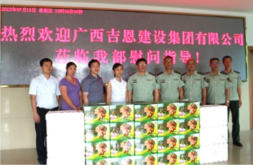 在八一建軍節(jié)即將來(lái)臨之際,公司中高層領(lǐng)導(dǎo)到廣西武警一支隊(duì)進(jìn)行慰問(wèn)。 為了加強(qiáng)警民聯(lián)系與溝通,推進(jìn)警民共建活動(dòng)的深化和開(kāi)展。2012年7月13日,公司委派中高層領(lǐng)導(dǎo)代表到廣西武警一支隊(duì)進(jìn)行八一慰問(wèn) ...查閱全文>>>