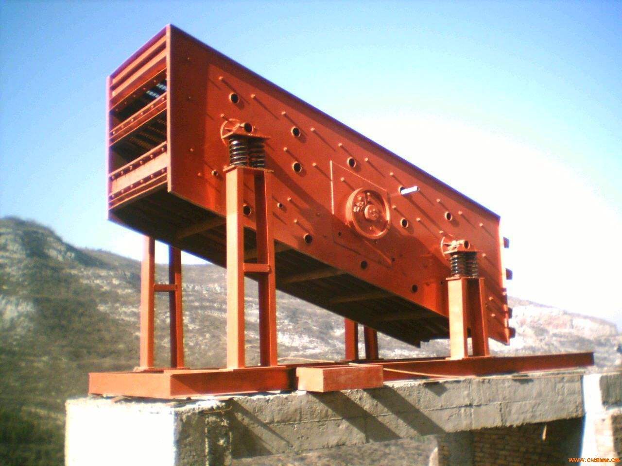 直線振動(dòng)篩由機(jī) 座、參振兩部份組成,振動(dòng)電機(jī)安裝在直線篩的長(zhǎng)方形篩架兩側(cè),通過彈性橡膠連接產(chǎn)生振動(dòng),調(diào)節(jié)振動(dòng)電機(jī)內(nèi)和重塊相位角,可以提高振幅和激 振力,所以,直線篩可以單層或多層使用。